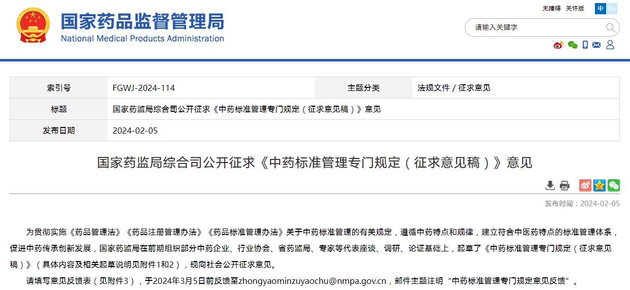 國家藥監局綜合司公開征求《中藥標準管理專門規定(征求意見稿)》意見