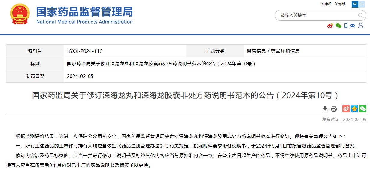 國家藥監局關于修訂深海龍丸和深海龍膠囊非處方藥說明書范本的公告(2024年第10號)