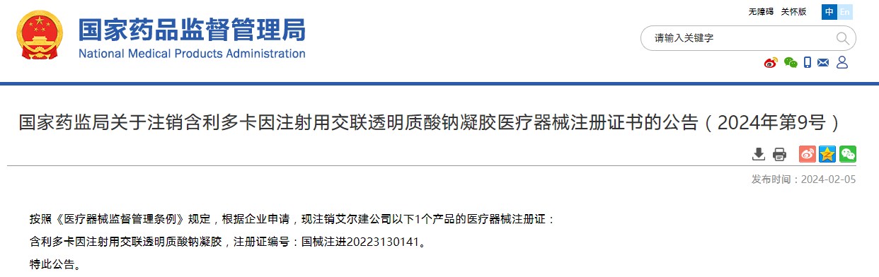 國家藥監局關于注銷含利多卡因注射用交聯透明質酸鈉凝膠醫療器械注冊證書的公告(2024年第9號)