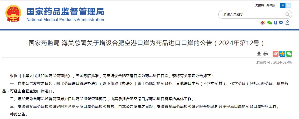 國家藥監局 海關總署關于增設合肥空港口岸為藥品進口口岸的公告(2024年第12號)