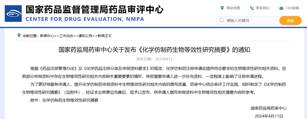 政策法規 | 《化學仿制藥生物等效性研究摘要》發布(附法規概覽04.01-04.12)