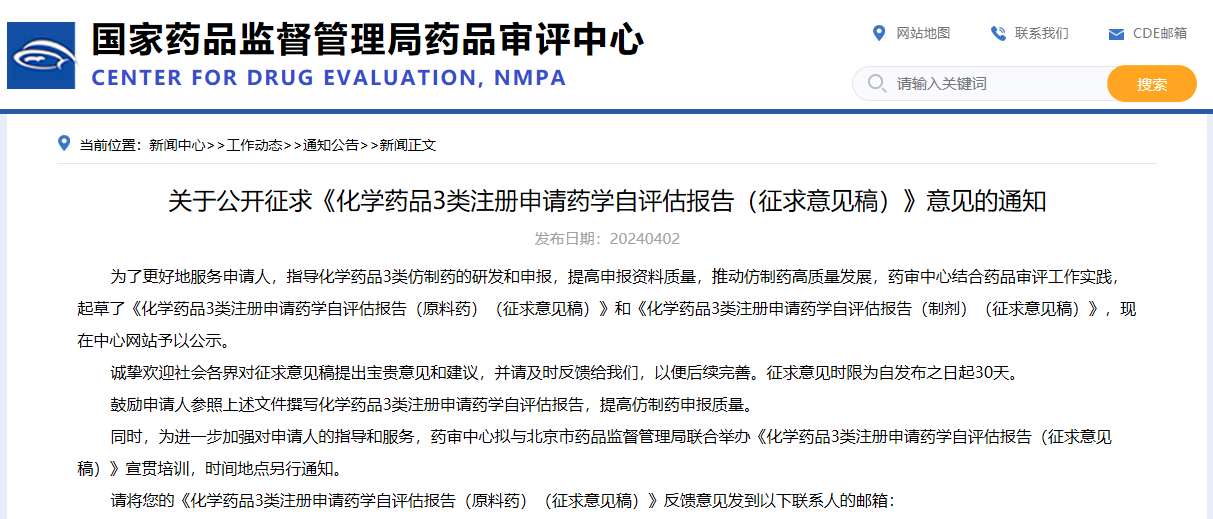 關于公開征求《化學藥品3類注冊申請藥學自評估報告(征求意見稿)》意見的通知