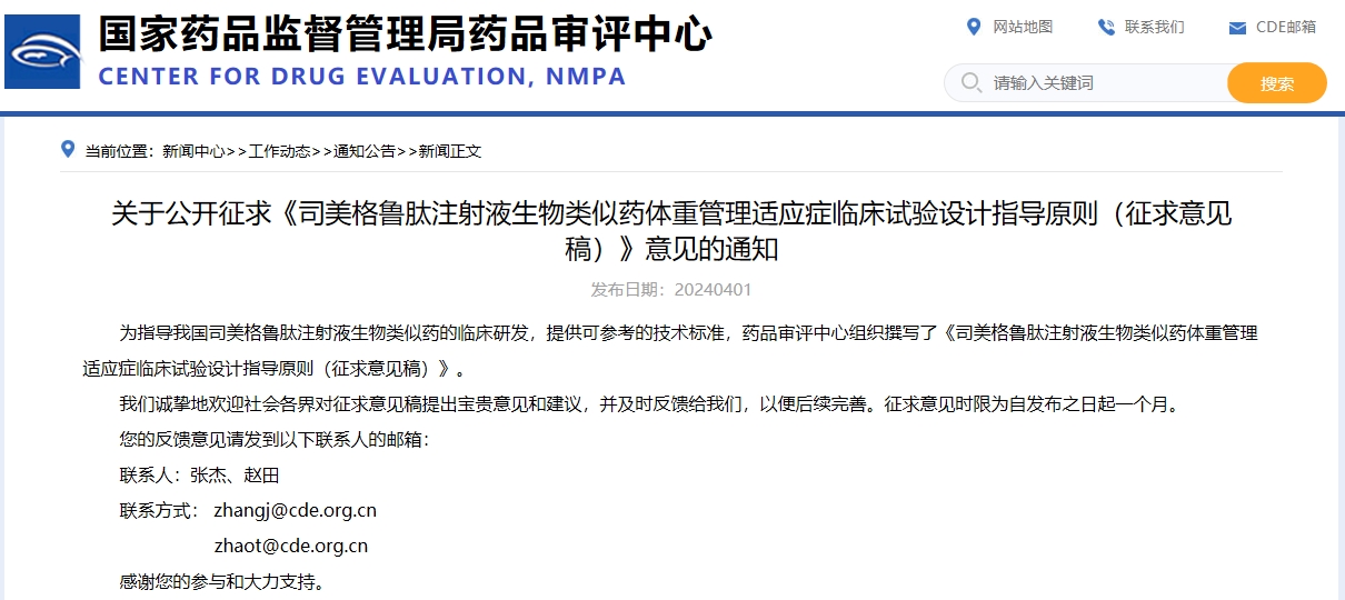 關于公開征求《司美格魯肽注射液生物類似藥體重管理適應癥臨床試驗設計指導原則(征求意見稿)》意見的通知