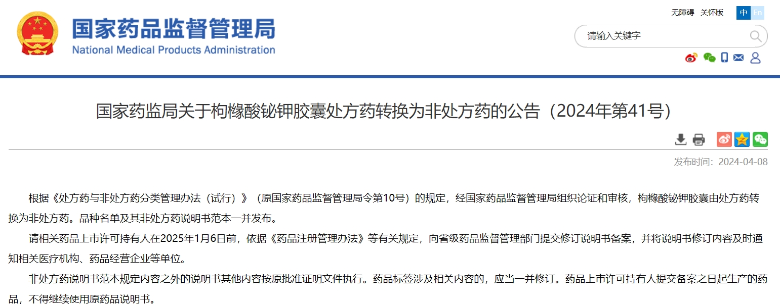 國家藥監局關于枸櫞酸鉍鉀膠囊處方藥轉換為非處方藥的公告(2024年第41號)