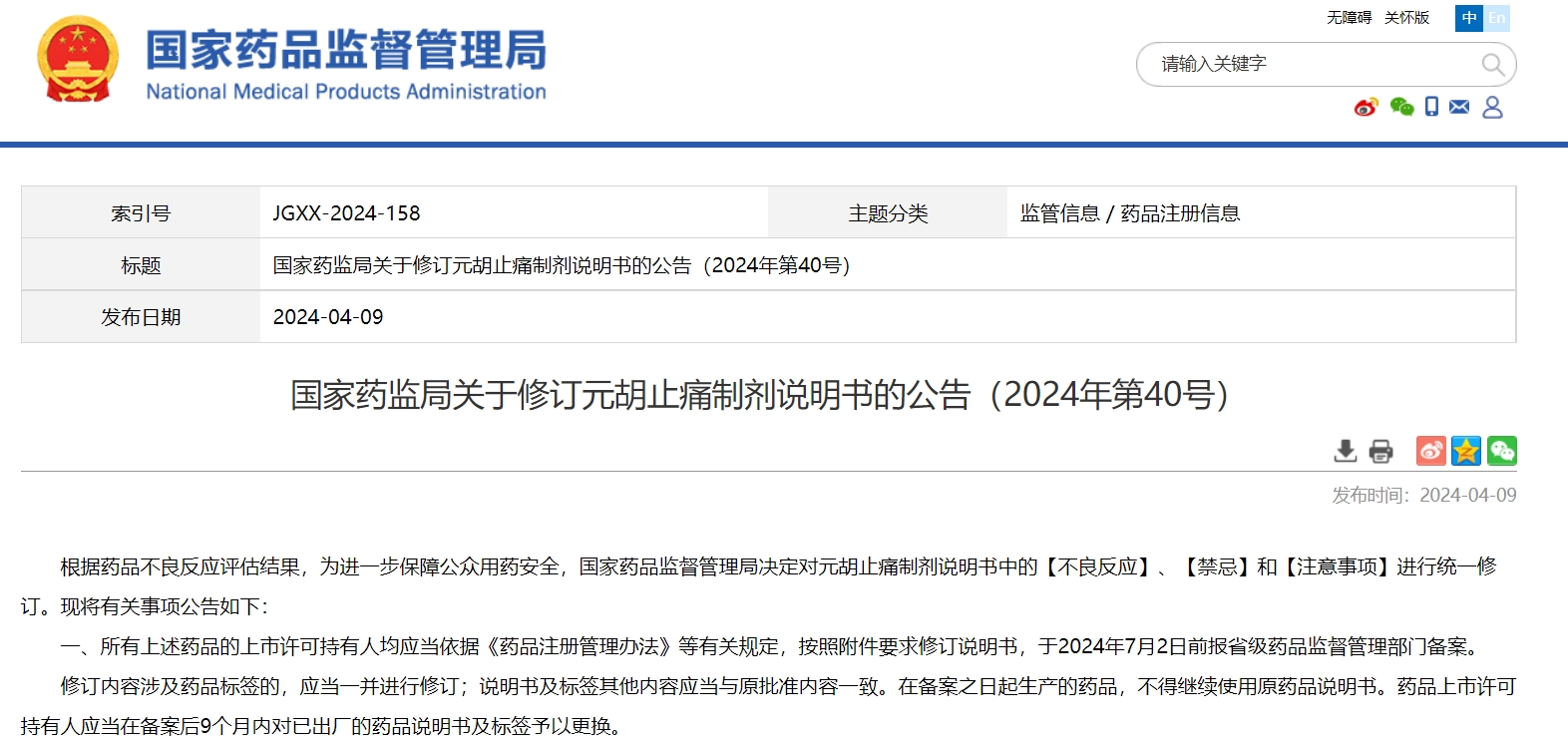 國家藥監局關于修訂元胡止痛制劑說明書的公告(2024年第40號)