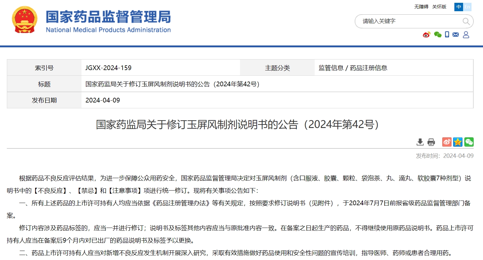 國家藥監局關于修訂玉屏風制劑說明書的公告(2024年第42號)