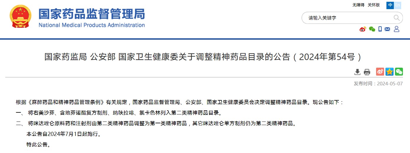 國(guó)家藥監(jiān)局 公安部 國(guó)家衛(wèi)生健康委關(guān)于調(diào)整精神藥品目錄的公告(2024年第54號(hào))