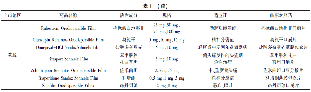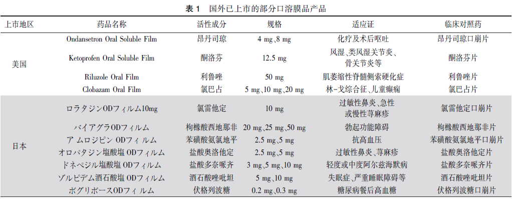 2006年,日本上市了第一個口溶膜處方藥伏格列波糖口溶膜。2010年,美國和歐洲分別上市第一個口溶膜處方藥昂丹司瓊口溶膜(Rapidfilm和Setofilm)。2020年,國家藥品監(jiān)督管理局批準(zhǔn)了第一個口溶膜化學(xué)藥品奧氮平口溶膜上市。目前,全球已有多個口溶膜產(chǎn)品上市,查詢美國、歐洲、日本藥品監(jiān)管機(jī)構(gòu)網(wǎng)站,部分品種信息見表1。