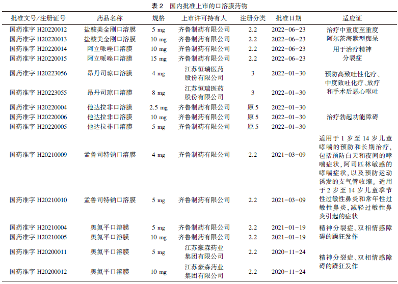 通過國家藥品監(jiān)督管理局網(wǎng)站查詢,統(tǒng)計了我國批準(zhǔn)的口溶膜藥物(見表2),共15個批準(zhǔn)文號,按照注冊分類統(tǒng)計,其中10個為2.2類改良型新藥,占大多數(shù);按適應(yīng)證統(tǒng)計,其中6個為精神障礙疾病藥物、3個為生殖系統(tǒng)疾病藥物、2個為精神神經(jīng)系統(tǒng)藥物、2個為呼吸系統(tǒng)疾病及抗過敏藥物、2個消化道及代謝藥物。