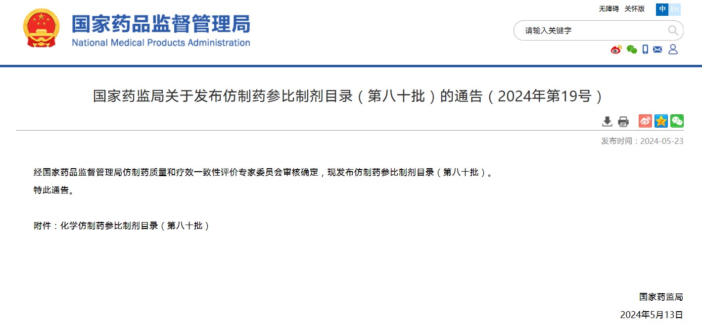 國家藥監局關于發布仿制藥參比制劑目錄(第八十批)的通告(2024年第19號)