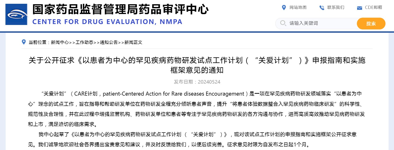關于公開征求《以患者為中心的罕見疾病藥物研發試點工作計劃(“關愛計劃”)》申報指南和實施框架意見的通知