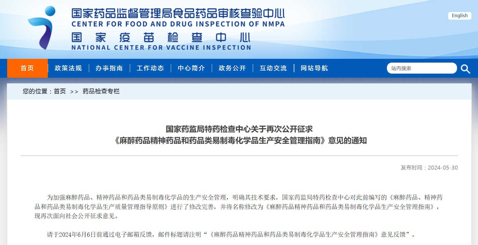 國(guó)家藥監(jiān)局特藥檢查中心關(guān)于再次公開征求 《麻醉藥品精神藥品和藥品類易制毒化學(xué)品生產(chǎn)安全管理指南》意見的通知