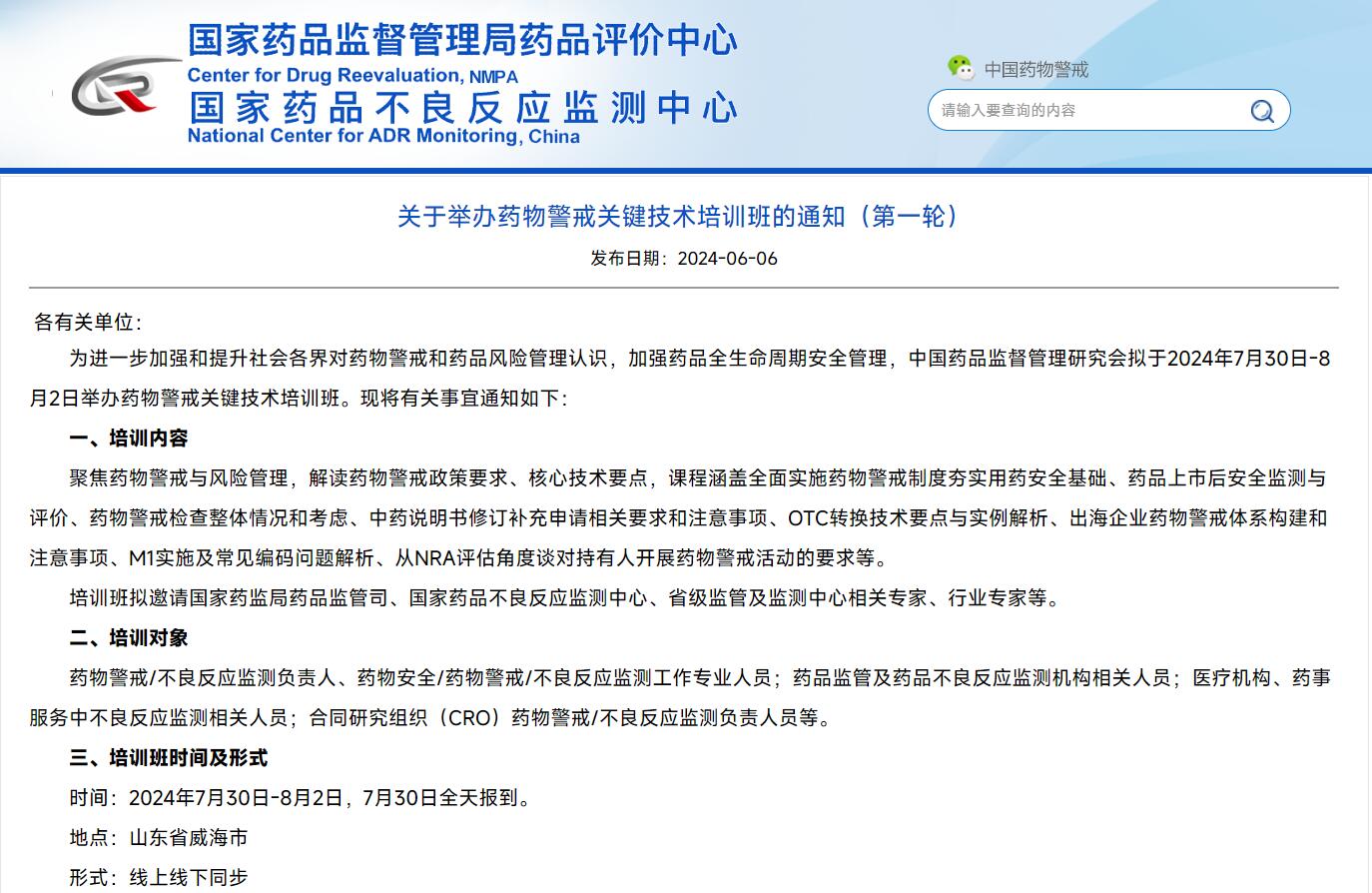 關(guān)于舉辦藥物警戒關(guān)鍵技術(shù)培訓(xùn)班的通知(第一輪)
