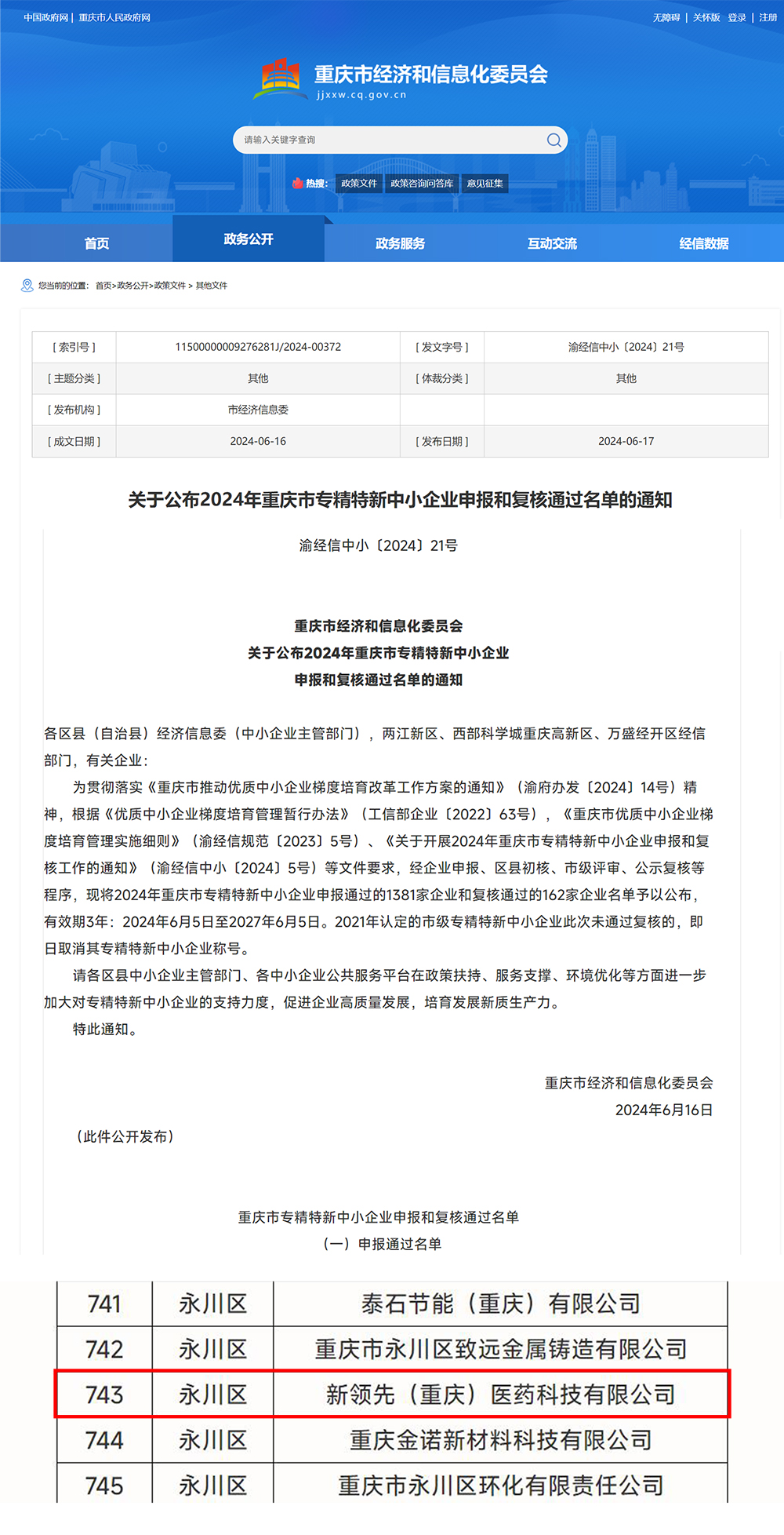 新領先(重慶)醫(yī)藥科技作為第一家落地永川的醫(yī)藥研發(fā)企業(yè),在永川區(qū)委區(qū)政府各級領導的大力支持下,不斷夯實藥學研究基礎,提升技術水平,已開展研發(fā)項目40余個,其中包含11個改良型新藥項目(獲7個臨床批件),申報專利16項,MAH獲得2個藥品生產(chǎn)許可B證,有近30個高端原料及制劑項目正在實驗室如火如荼地推進。高效完成質(zhì)量體系建設工作,2023年取得了ISO9001質(zhì)量管理體系認證。產(chǎn)學研合作同步進行,與重慶大學藥學院、重慶醫(yī)科大學附屬永川醫(yī)院達成戰(zhàn)略合作,“重慶大學藥學院研究生聯(lián)合培養(yǎng)基地“、”重慶大學藥學院實訓基地”、“重慶大學藥學院大學生創(chuàng)業(yè)基地”、“新領先(重慶)&重慶醫(yī)科大學附屬永川醫(yī)院聯(lián)合研究中心”、“西部職教基地產(chǎn)教聯(lián)合體常務理事單位”等陸續(xù)掛牌。此次新領先(重慶)成功獲評重慶市“專精特新”中小企業(yè),是對公司專業(yè)化水平、創(chuàng)新能力以及發(fā)展?jié)摿Φ恼J可。未來,公司將繼續(xù)秉承“是我讓中國新藥技術和生產(chǎn)工藝與世界同步”的企業(yè)愿景,不斷加大科研創(chuàng)新投入,突破醫(yī)藥研發(fā)核心技術,全面轉(zhuǎn)型升級,助力新質(zhì)生產(chǎn)力發(fā)展!