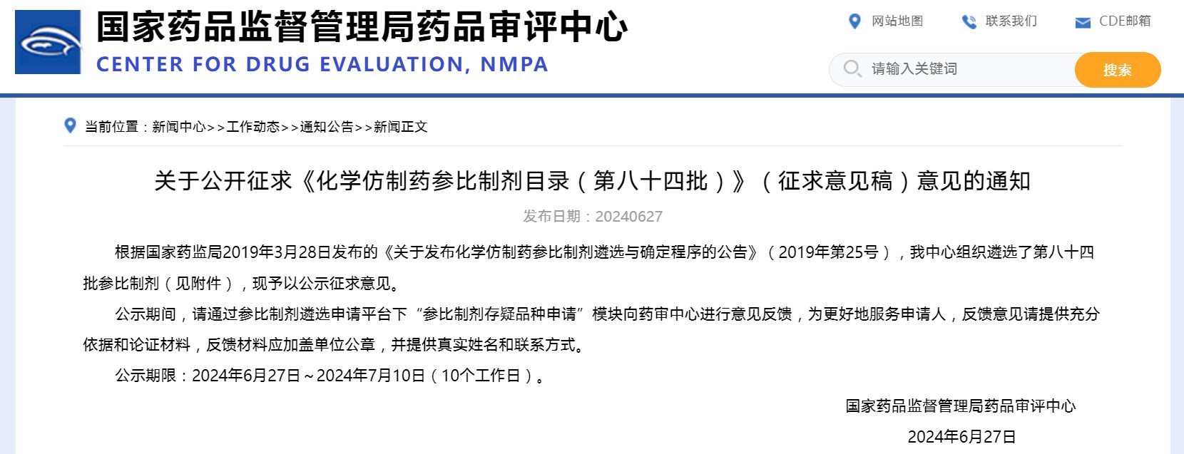 關于公開征求《化學仿制藥參比制劑目錄(第八十四批)》(征求意見稿)意見的通知
