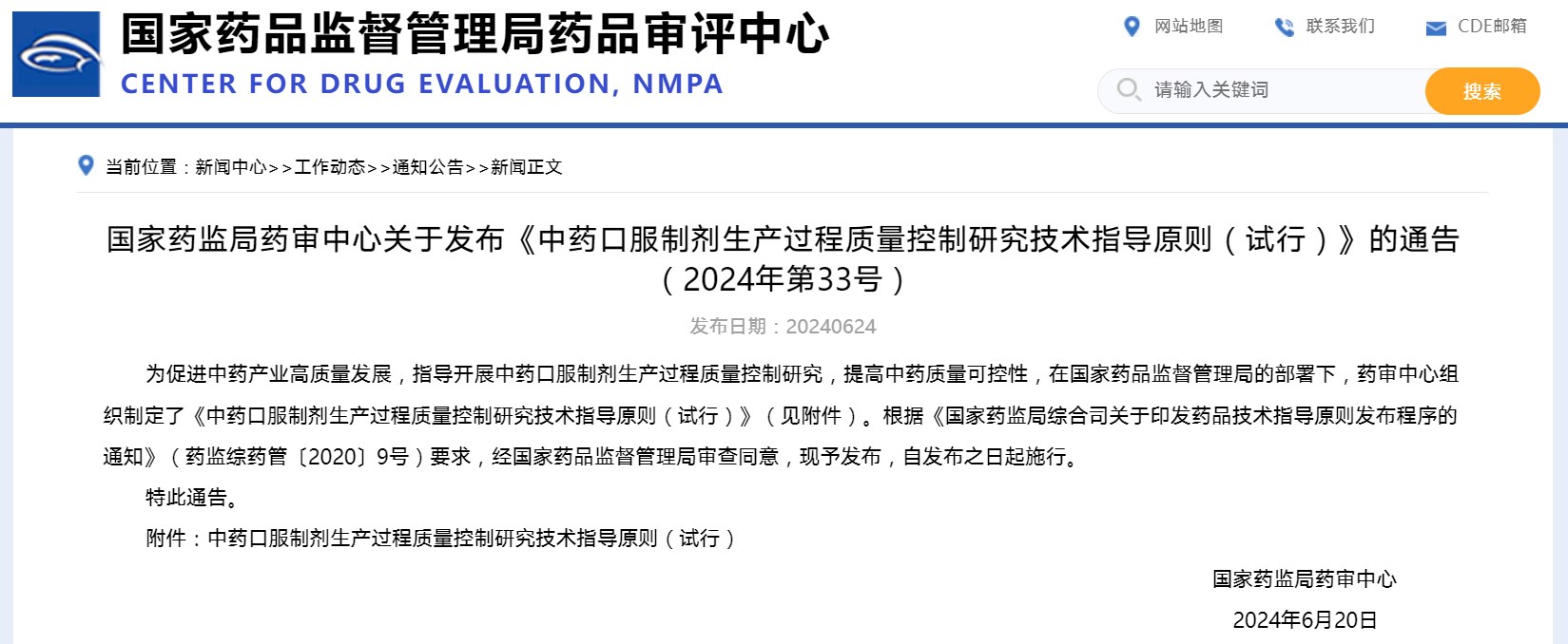 關于發布《中藥口服制劑生產過程質量控制研究技術指導原則(試行)》的通告