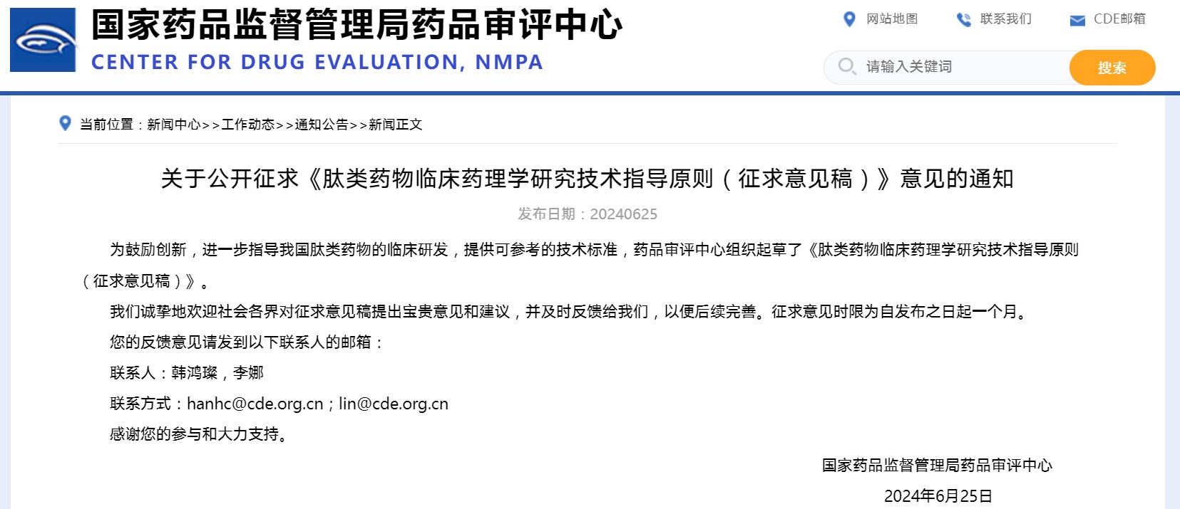 關于公開征求《肽類藥物臨床藥理學研究技術指導原則(征求意見稿)》意見的通知