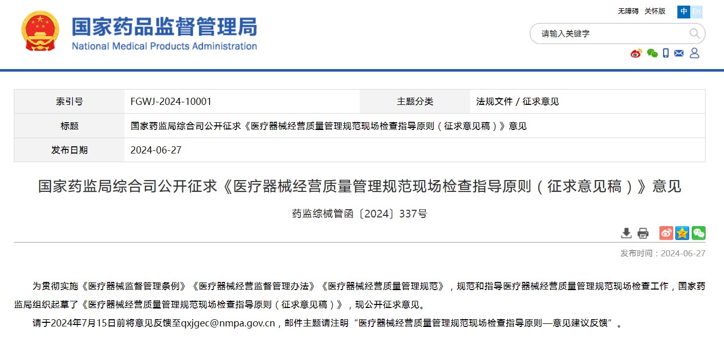 公開征求《醫療器械經營質量管理規范現場檢查指導原則(征求意見稿)》意見