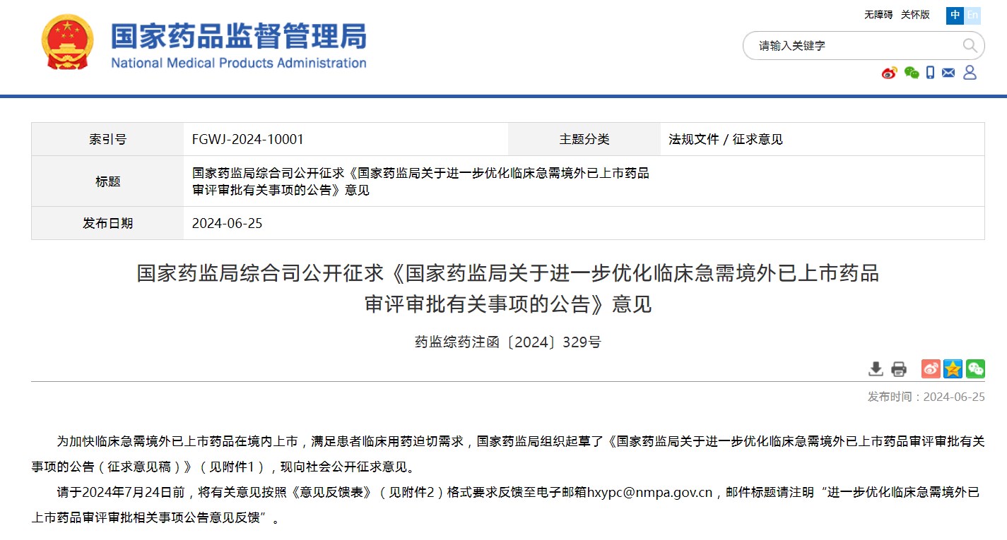 公開征求《國家藥監局關于進一步優化臨床急需境外已上市藥品審評審批有關事項的公告》意見