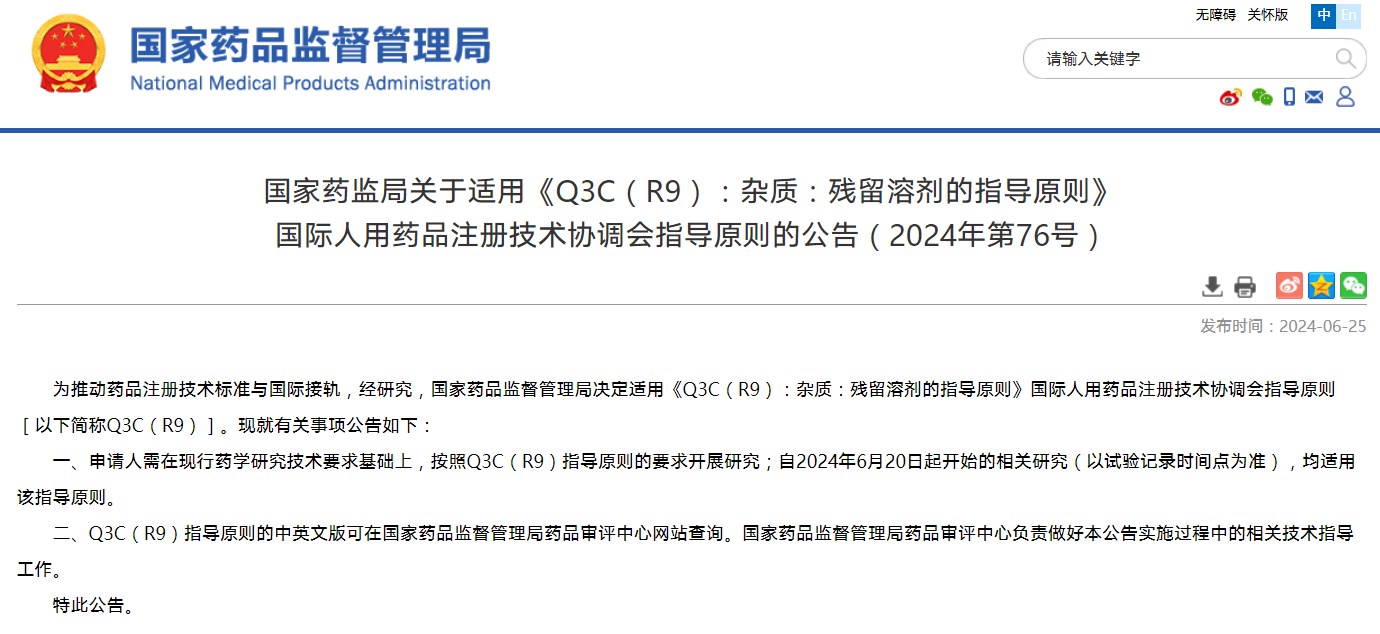 關于適用《Q3C(R9):雜質:殘留溶劑的指導原則》國際人用藥品注冊技術協調會指導原則的公告