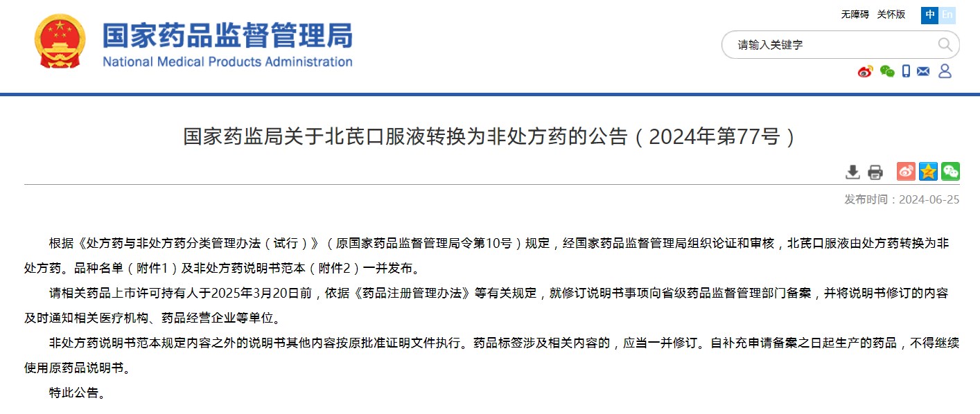 關于北芪口服液轉換為非處方藥的公告