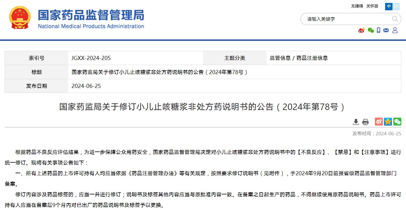 關于修訂小兒止咳糖漿非處方藥說明書的公告