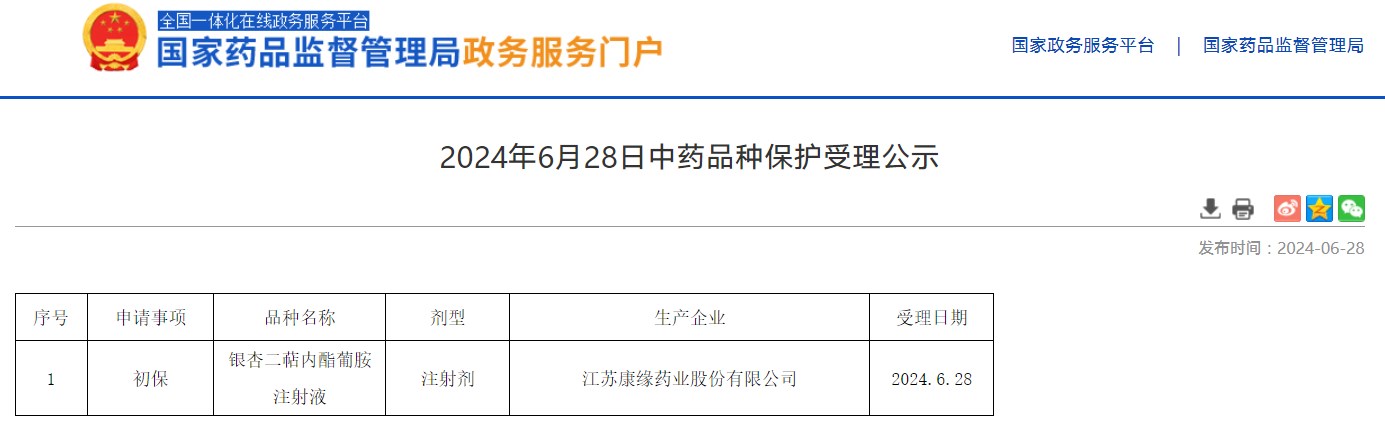 2024年6月28日中藥品種保護受理公示