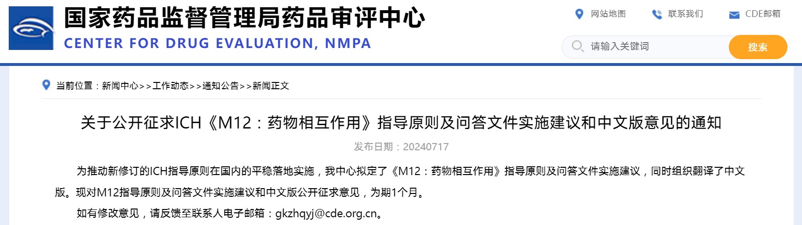 關于公開征求ICH《M12:藥物相互作用》指導原則及問答文件實施建議和中文版意見的通知