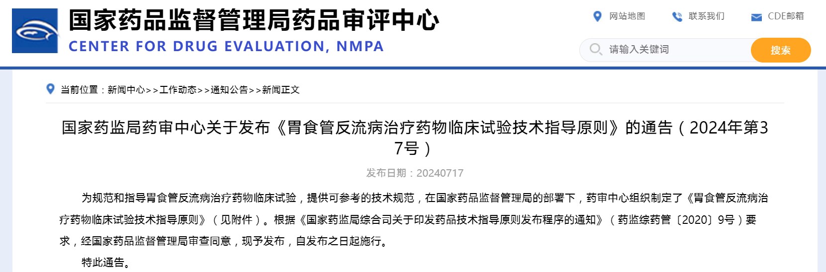 國家藥監局藥審中心關于發布《胃食管反流病治療藥物臨床試驗技術指導原則》的通告(2024年第37號)