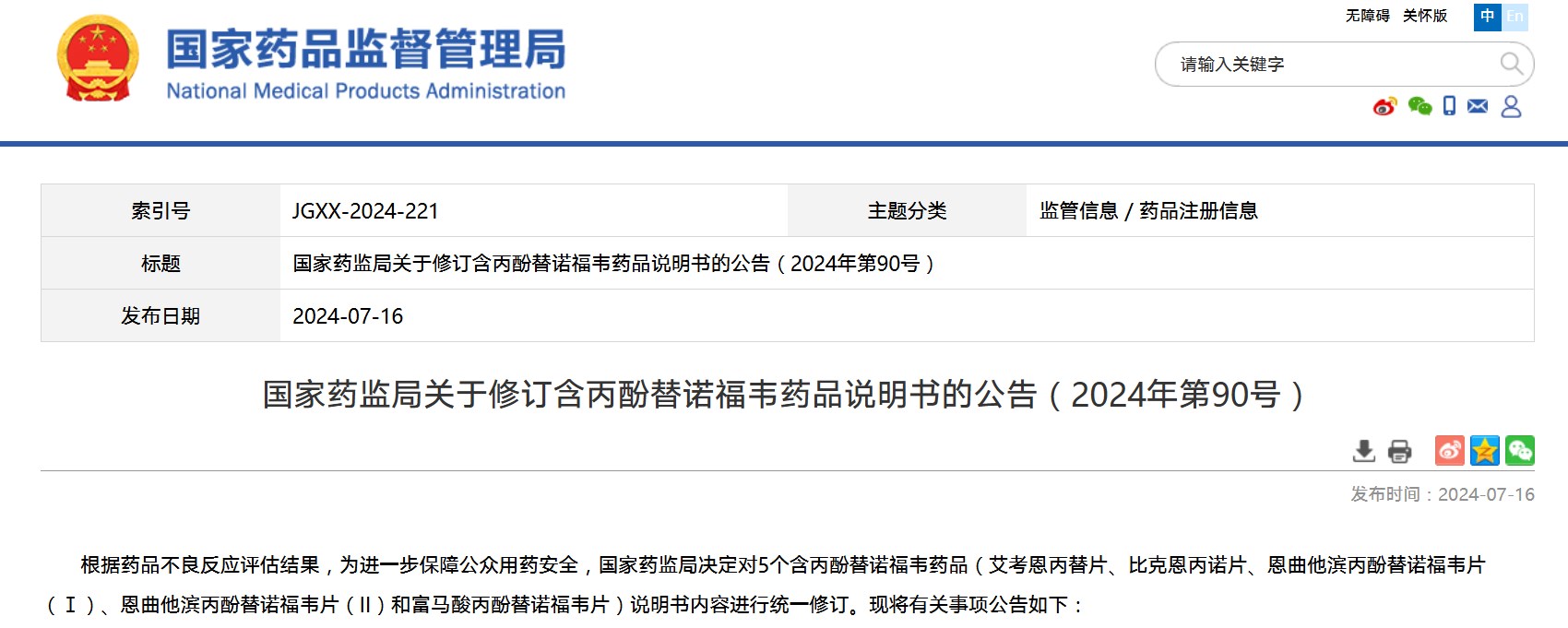 國家藥監局關于修訂含丙酚替諾福韋藥品說明書的公告(2024年第90號)