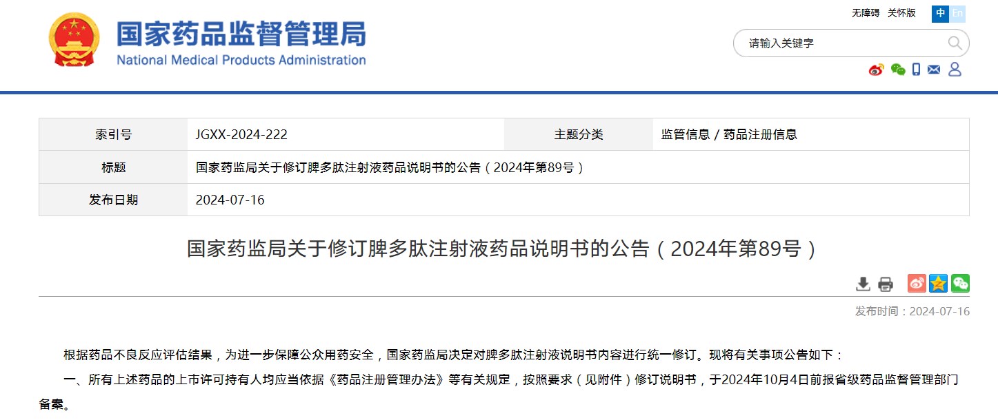 國家藥監局關于修訂脾多肽注射液藥品說明書的公告(2024年第89號)