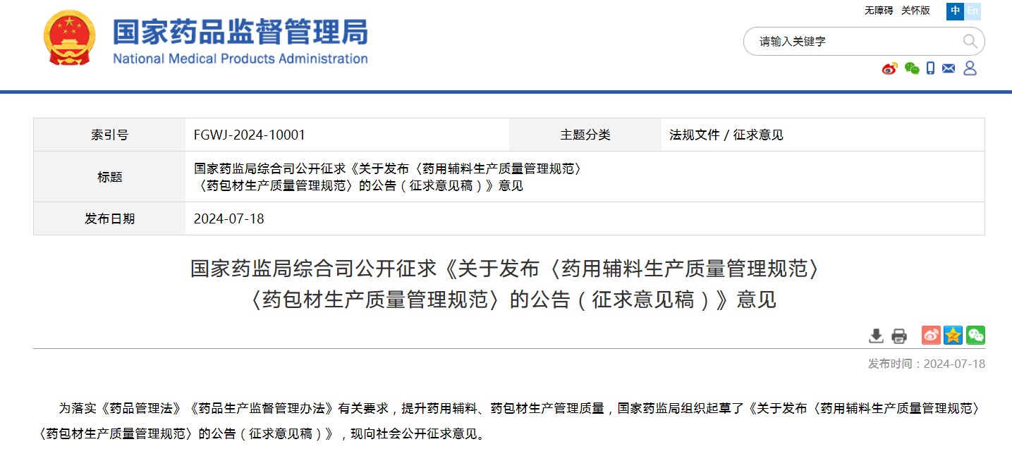 國家藥監局綜合司公開征求《關于發布〈藥用輔料生產質量管理規范〉〈藥包材生產質量管理規范〉的公告(征求意見稿)》意見