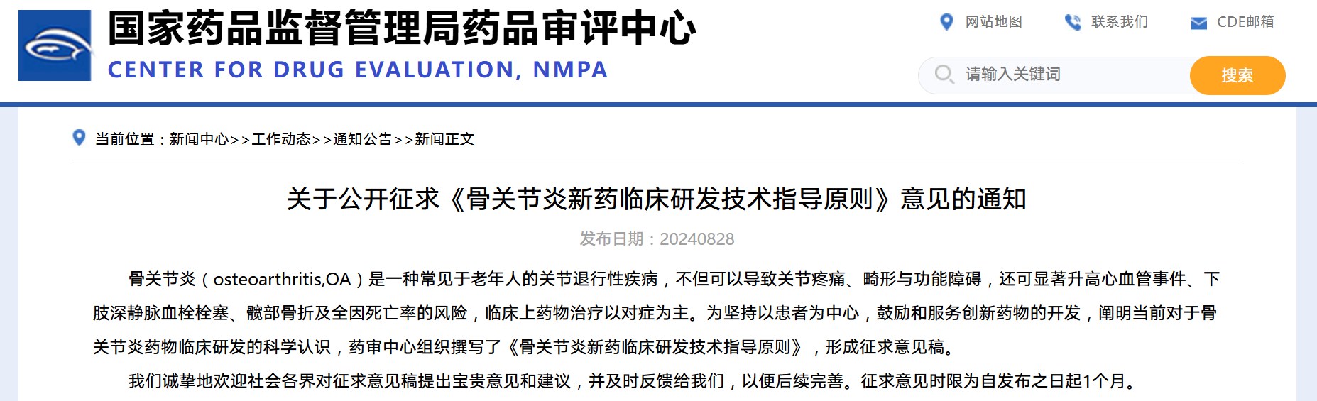 國家藥監局藥審中心關于公開征求《骨關節炎新藥臨床研發技術指導原則》意見的通知