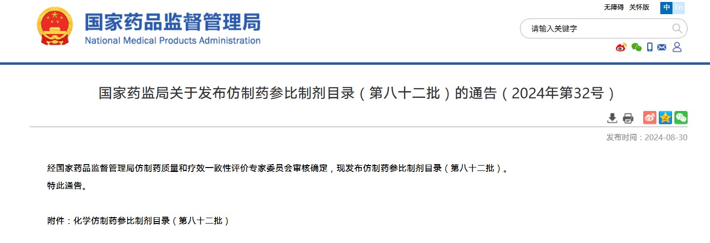 國家藥監局關于發布仿制藥參比制劑目錄(第八十二批)的通告(2024年第32號)