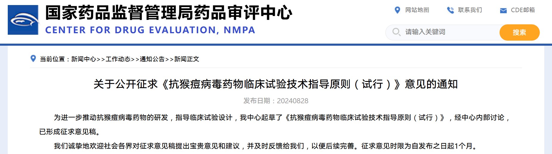 關于公開征求《抗猴痘病毒藥物臨床試驗技術指導原則(試行)》意見的通知