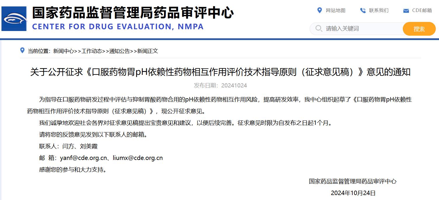 關于公開征求《口服藥物胃pH依賴性藥物相互作用評價技術指導原則(征求意見稿)》意見的通知國家藥監局