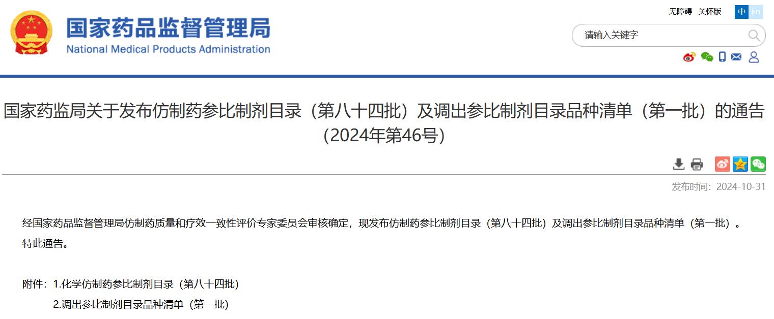 關于發布仿制藥參比制劑目錄(第八十四批)及調出參比制劑目錄品種清單(第一批)的通告(2024年第46號)