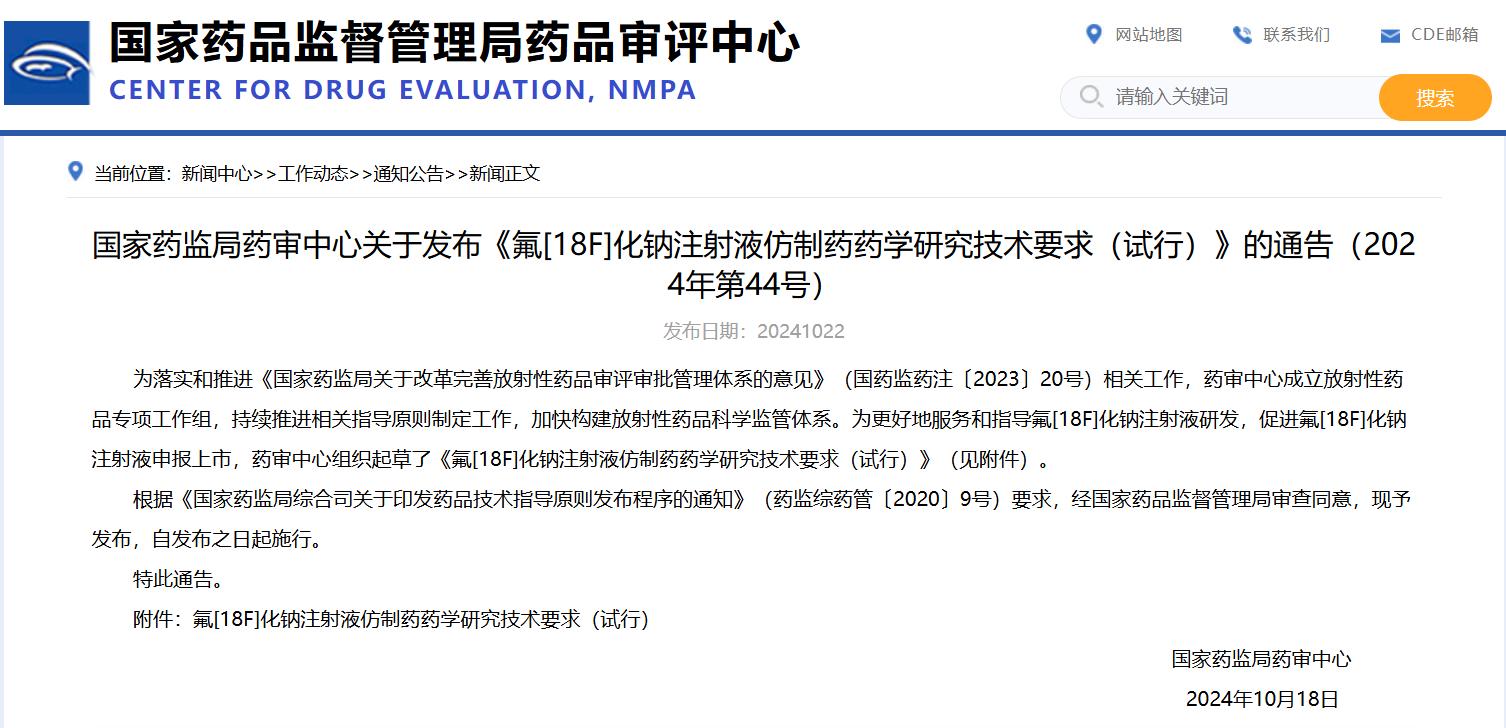 國家藥監局藥審中心關于發布《氟[18F]化鈉注射液仿制藥藥學研究技術要求(試行)》的通告(2024年第44號)