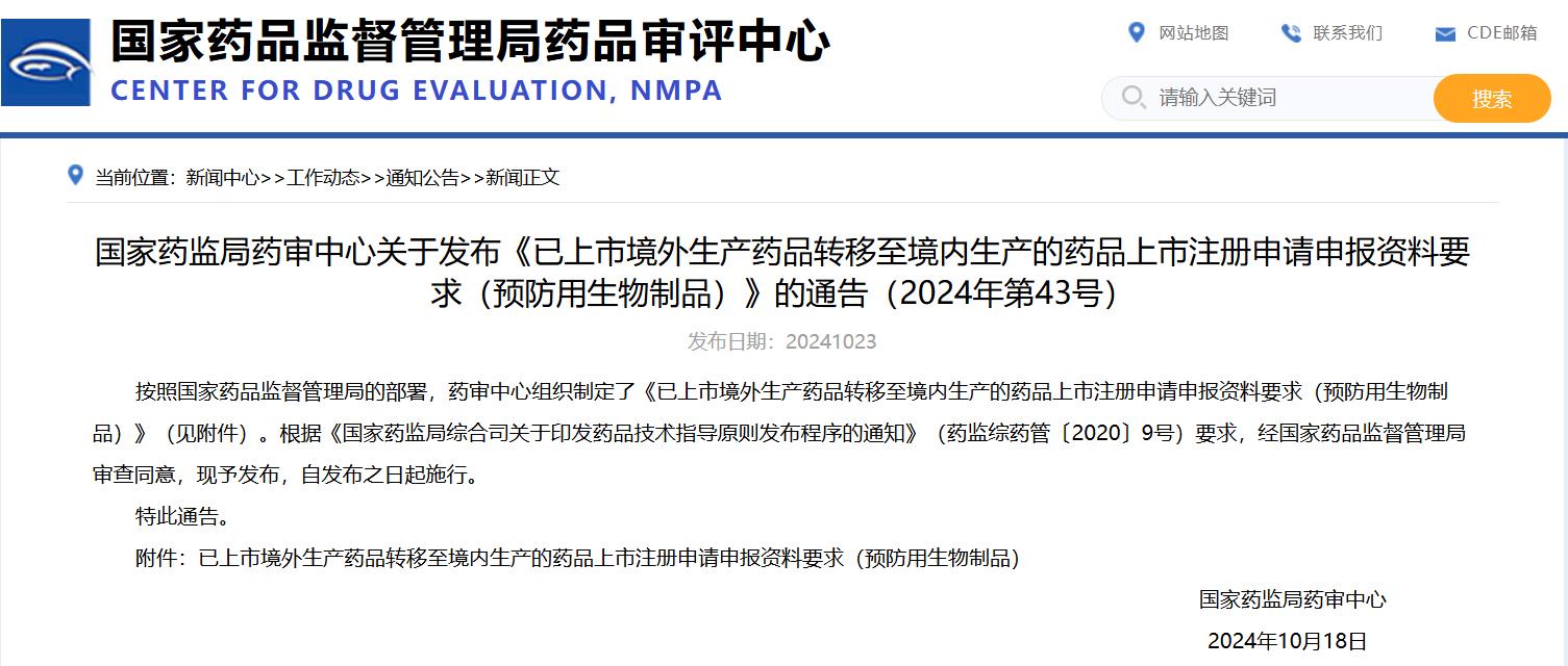 國家藥監局藥審中心關于發布《已上市境外生產藥品轉移至境內生產的藥品上市注冊申請申報資料要求(預防用生物制品)》的通告(2024年第43號)