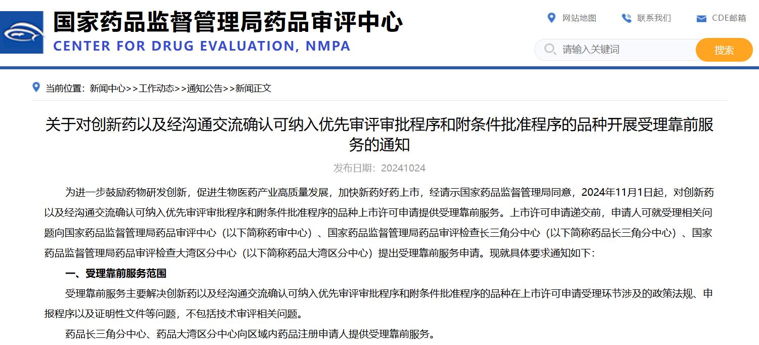 關于對創新藥以及經溝通交流確認可納入優先審評審批程序和附條件批準程序的品種開展受理靠前服務的通知