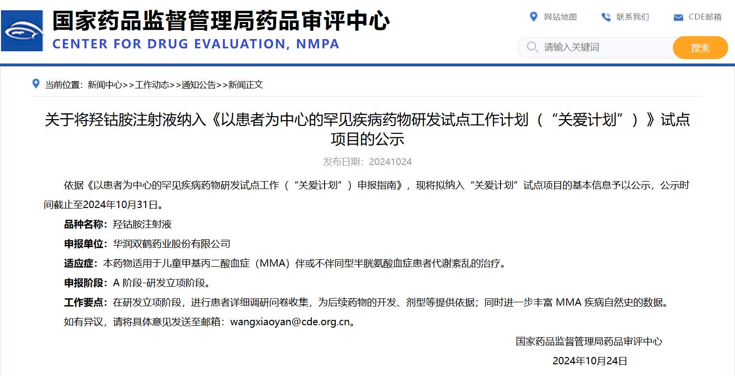 關于將羥鈷胺注射液納入《以患者為中心的罕見疾病藥物研發試點工作計劃(“關愛計劃”)》試點項目的公示
