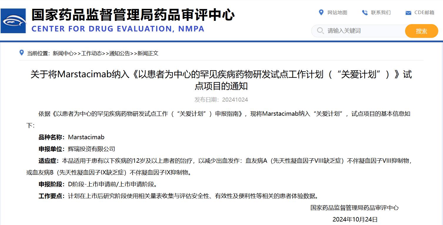 關于將Marstacimab納入《以患者為中心的罕見疾病藥物研發試點工作計劃(“關愛計劃”)》試點項目的通知