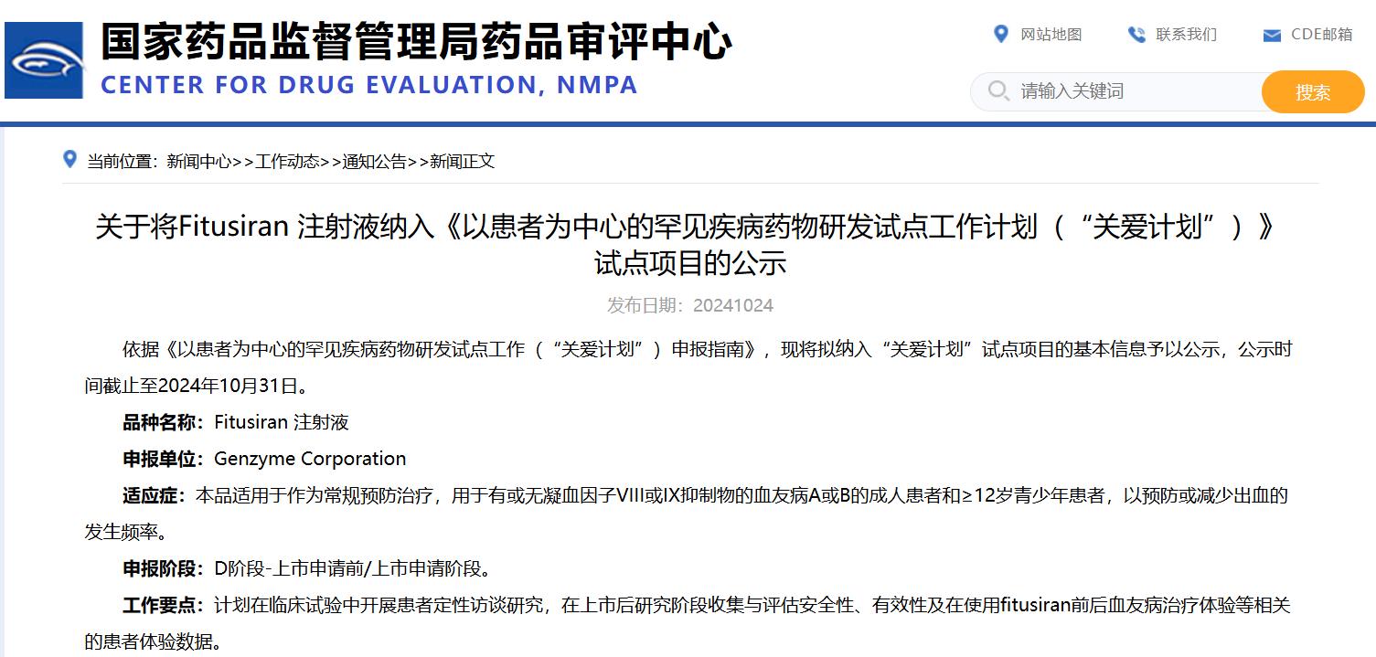 關于將Fitusiran 注射液納入《以患者為中心的罕見疾病藥物研發試點工作計劃(“關愛計劃”)》試點項目的公示