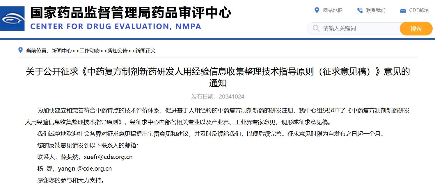 關于公開征求《中藥復方制劑新藥研發人用經驗信息收集整理技術指導原則(征求意見稿)》意見的通知