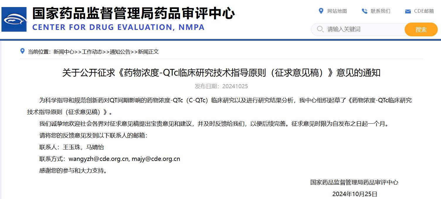關于公開征求《藥物濃度-QTc臨床研究技術指導原則(征求意見稿)》意見的通知