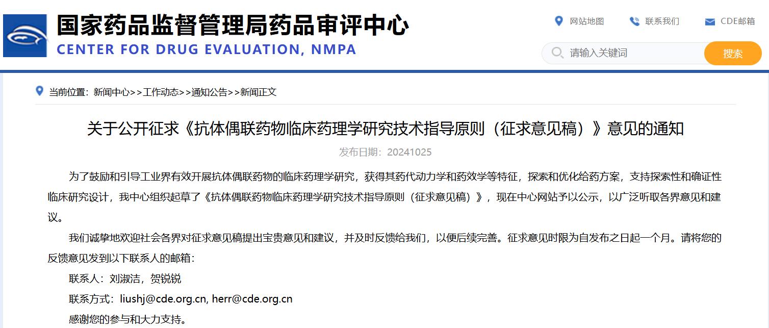 關于公開征求《抗體偶聯藥物臨床藥理學研究技術指導原則(征求意見稿)》意見的通知