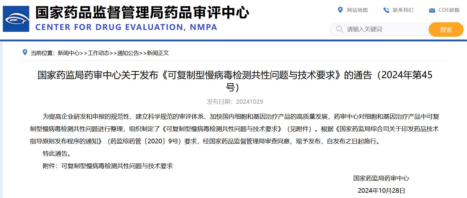 國家藥監局藥審中心關于發布《可復制型慢病毒檢測共性問題與技術要求》的通告(2024年第45號)