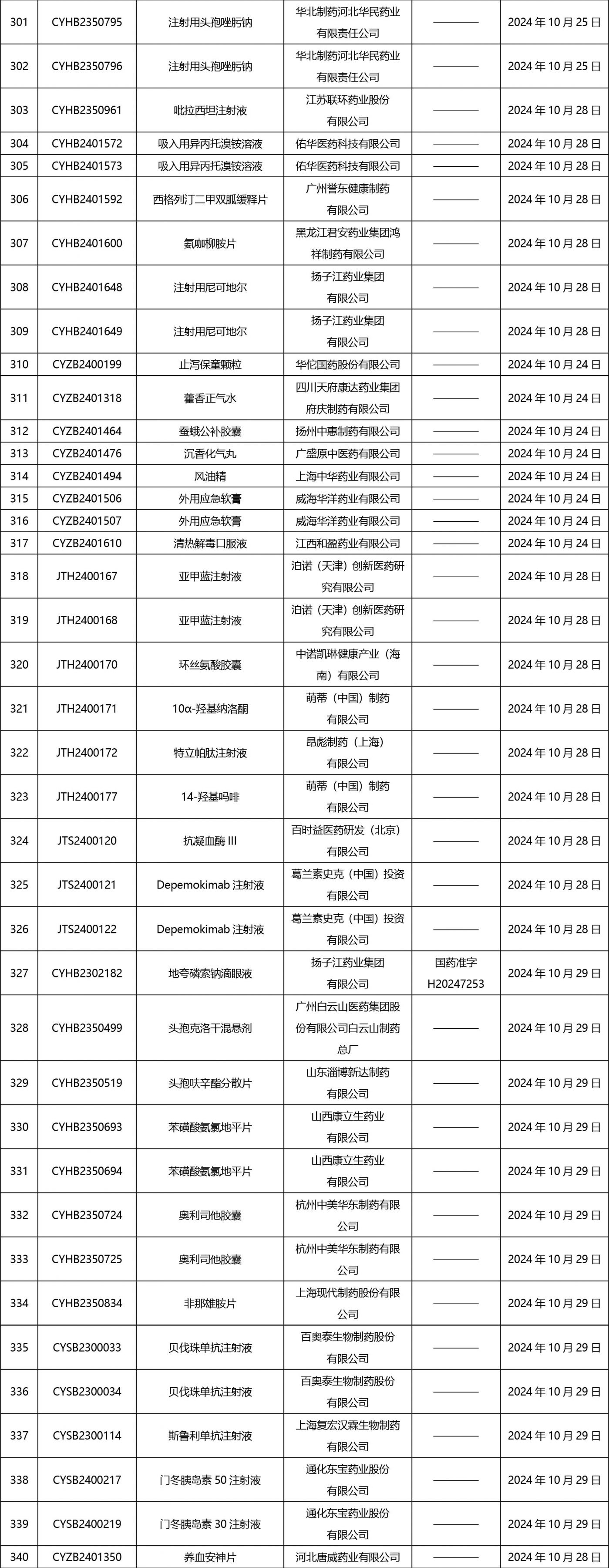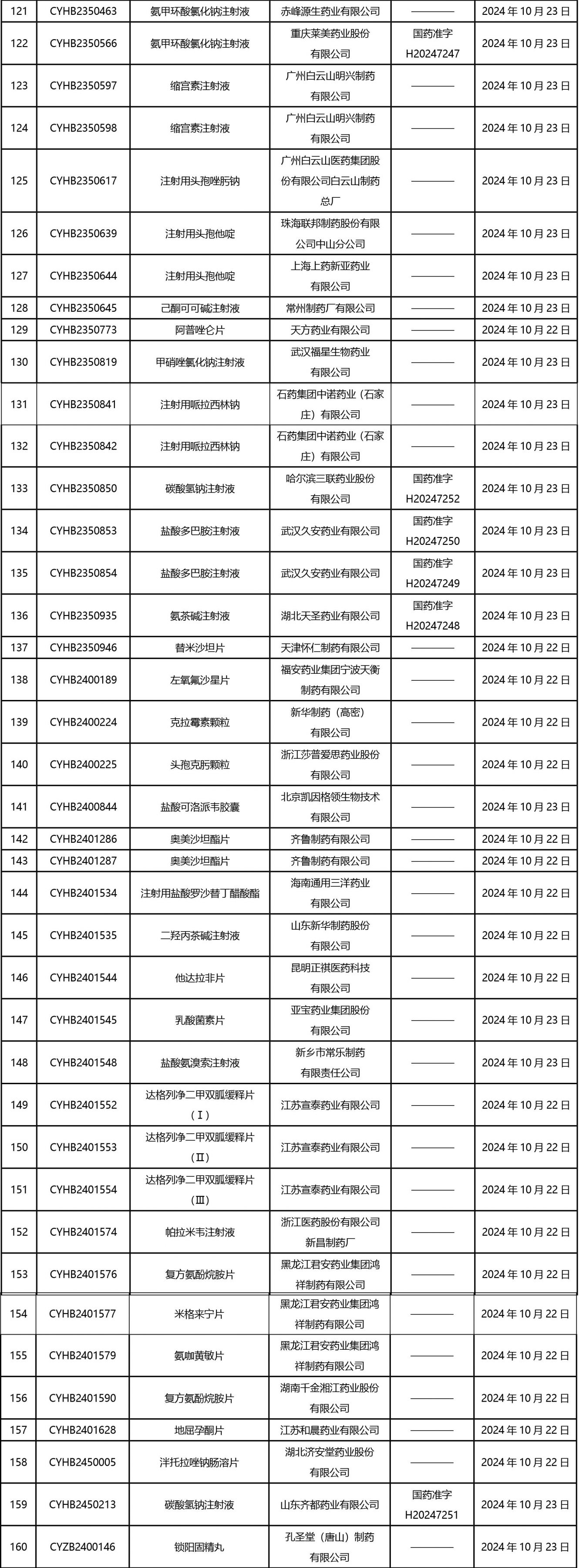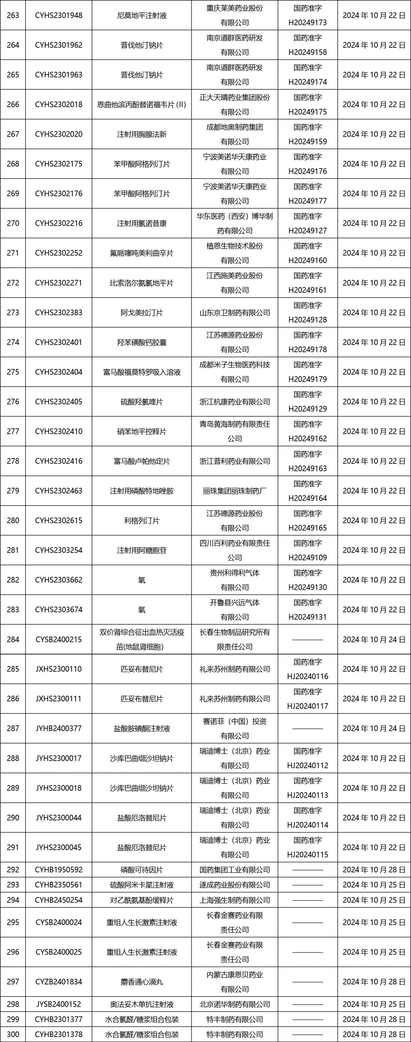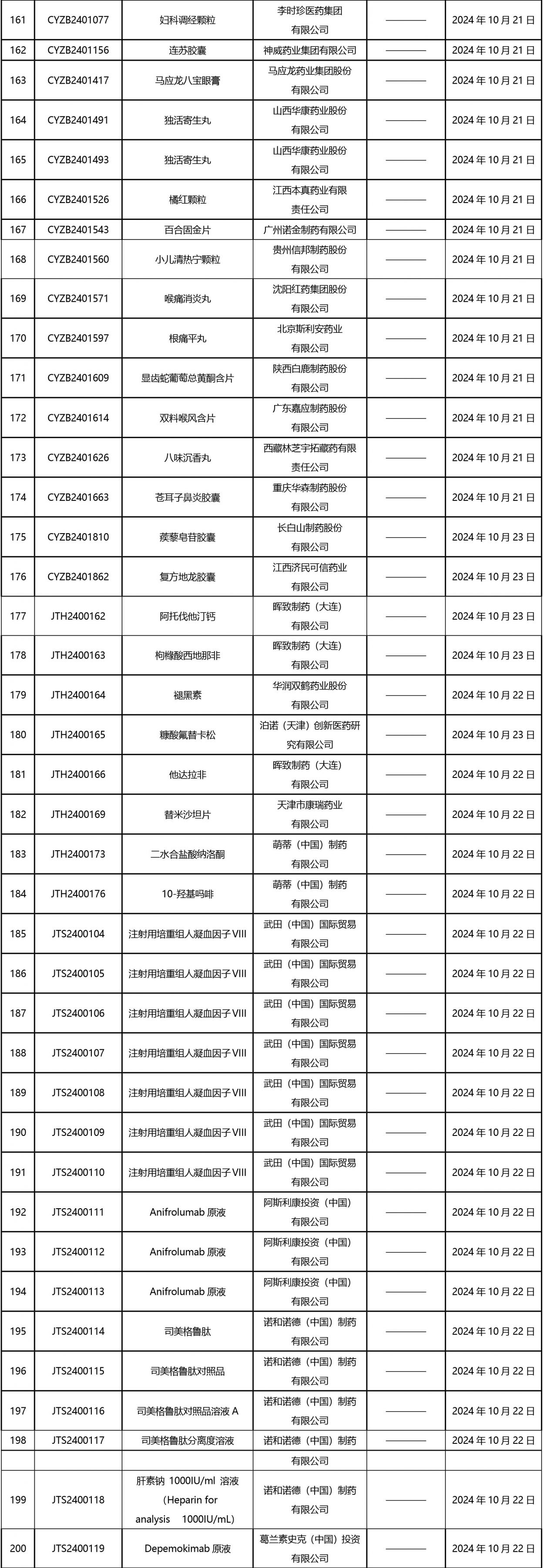 2024年10月21日至2024年11月1日 16:00發布368個待領取藥品批準證明文件,其中注射液125個,一致性評價品種45個。