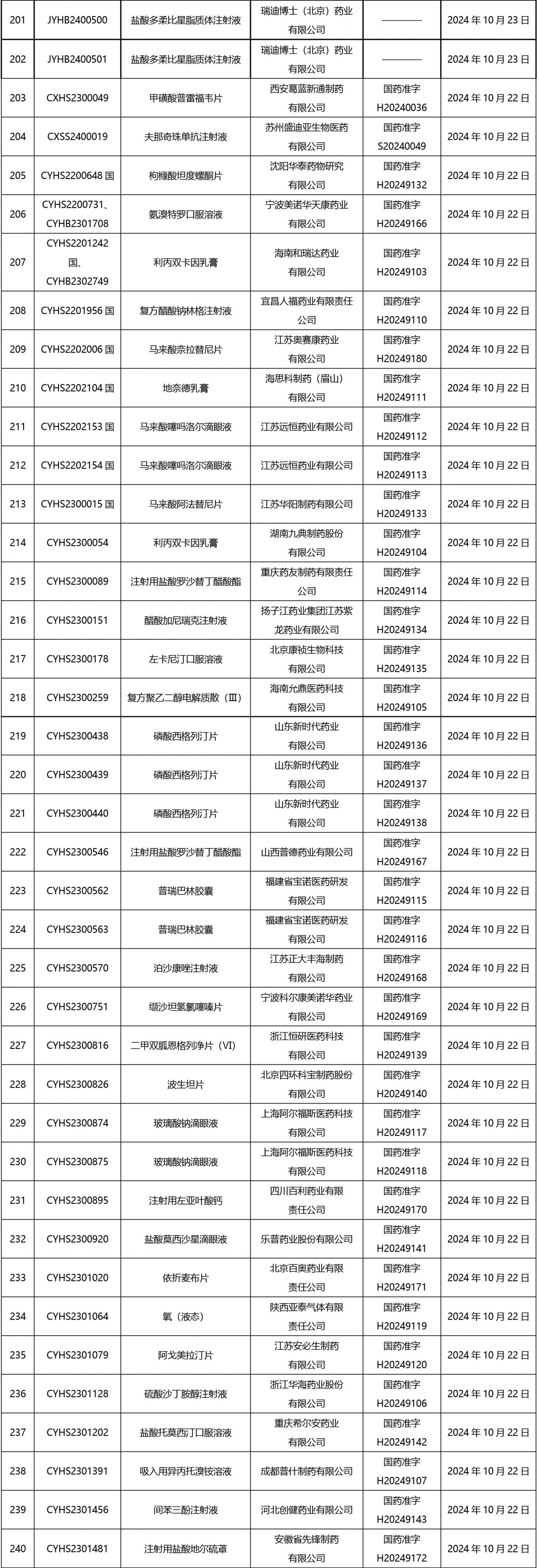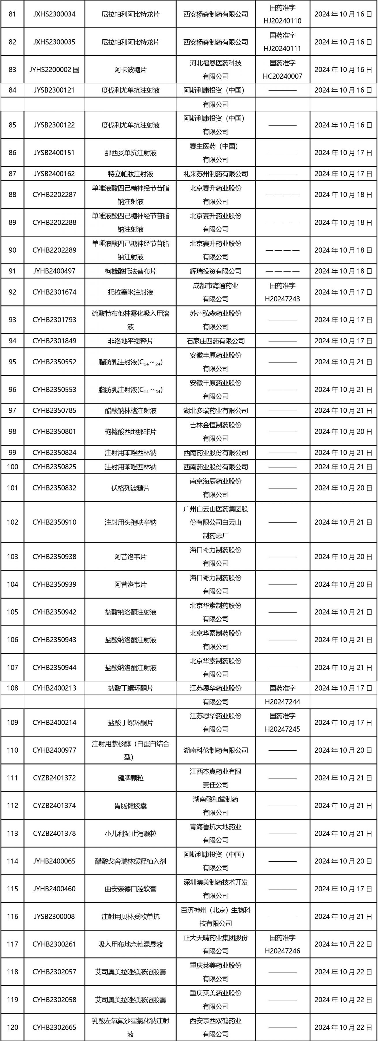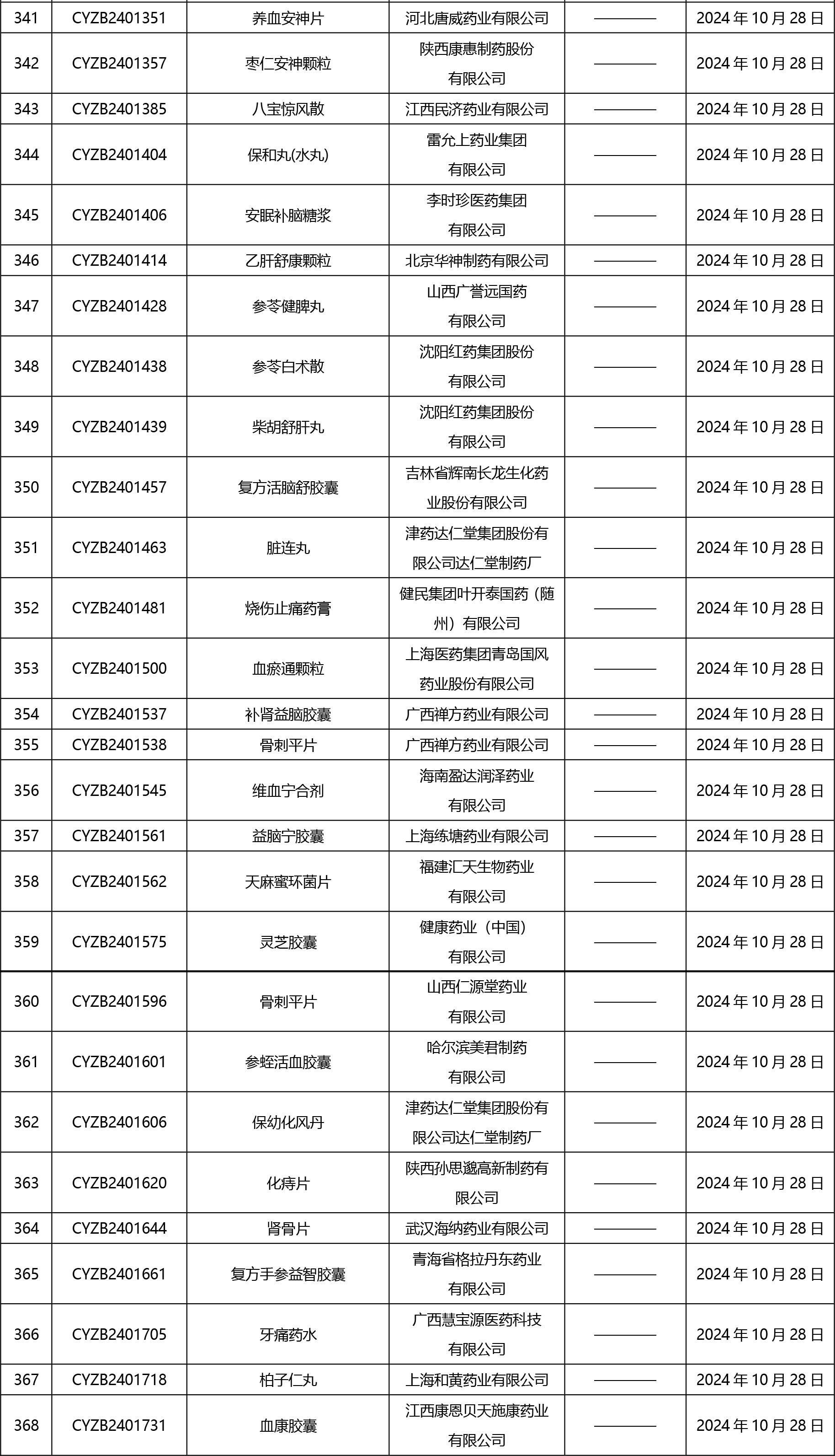 2024年10月21日至2024年11月1日 16:00發布368個待領取藥品批準證明文件,其中注射液125個,一致性評價品種45個。